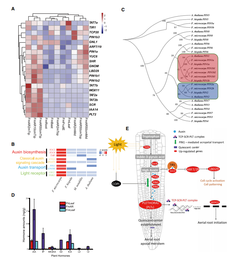 細(xì)葉榕與對葉榕顯著差異表現(xiàn)為前者有氣生根而后者沒有,為了尋找觸發(fā)氣生根的途徑,作者在氣生根尖鑒定到811個高表達(dá)基因。這些高表達(dá)的基因在一系列與運輸相關(guān)的生物過程中顯著富集。通過對PIN家族的系統(tǒng)發(fā)育分析,發(fā)現(xiàn)PIN1基因存在顯著的拷貝數(shù)變異(CNV),并確定了兩個進(jìn)化的PIN1亞群。第一組(PIN1a)在兩種榕樹和擬南芥中均被鑒定到,第二組(PIN1b)僅于兩種榕樹中。RNA-seq表明,FmPIN1a在大多數(shù)被測組織中均有表達(dá),而FmPIN1b1、FmPIN1b2FmPIN1b3在氣生根樣品中高表達(dá)。光受體CRY2和PHR2的拷貝數(shù)增加,TAR(如TAT2a、TAT2b和TAT7b)和YUC編碼基因(如YUC6)的表達(dá)增加進(jìn)一步加速了IAA的積累,與對葉榕相比,細(xì)葉榕氣生根尖的內(nèi)源生長素濃度高出5倍。說明生長素的增加引發(fā)了氣生根的發(fā)育,光促進(jìn)的生長素依賴途徑與氣生根的發(fā)生、生長和形態(tài)形成有關(guān)。