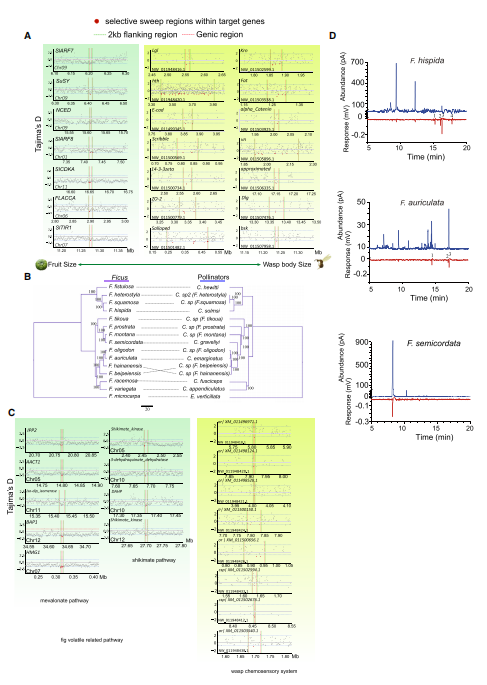 七千五百萬年來,榕樹和榕小蜂之間的專性協(xié)同進(jìn)化在這個協(xié)同進(jìn)化系統(tǒng)中形成了形態(tài)和生理上的相適應(yīng)。榕樹在全球和當(dāng)?shù)囟加袠O高的物種多樣性,同域近緣榕果物種間生殖隔離的主要原因是傳粉蜂的特異性。為了探討榕果與傳粉蜂協(xié)同進(jìn)化的潛在分子機(jī)制,作者利用14個來自Sycomorus亞屬的榕樹和其相應(yīng)傳粉蜂的重測序數(shù)據(jù)進(jìn)行分析。系統(tǒng)發(fā)育分析表明,在這個分類水平上,寄主關(guān)聯(lián)具有很強的保守性,同時也檢測到一些寄主轉(zhuǎn)移事件。為了確定在這些協(xié)同進(jìn)化的物種中可能經(jīng)歷了相互選擇和分化的候選基因,作者利用Tajima’D和SweeD分析對榕果和傳粉蜂基因組進(jìn)行了選擇性清除分析,顯示在榕果和傳粉蜂中生長相關(guān)的基因、榕果揮發(fā)物相關(guān)基因和傳粉蜂化學(xué)感應(yīng)系統(tǒng)相關(guān)基因受到一定的選擇作用。并通過榕小蜂對三種不同榕果釋放揮發(fā)物質(zhì)的電生理測試,支持了甲羥戊酸和莽草酸途徑在吸引特定傳粉者方面的重要作用(圖5),揭示了在這種專性互利共生中共分化的潛在分子機(jī)制。