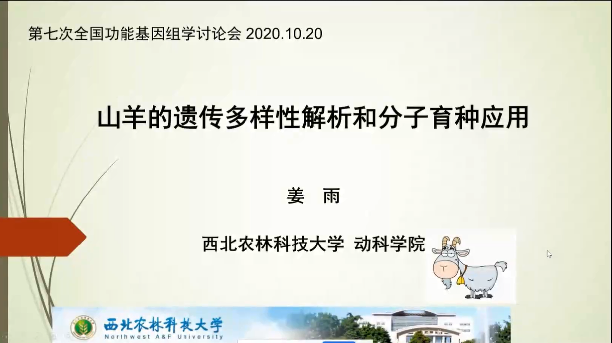 西北農(nóng)林科技大學(xué)姜雨教授風(fēng)趣而系統(tǒng)的解析了世界山羊品種的遺傳來(lái)源,并在山羊上鑒定出關(guān)鍵抗病基因MUC6。展示了基于世界主要家畜的SNP和CNV等變異信息和頻率構(gòu)建的家畜遺傳變異數(shù)據(jù)庫(kù)。最后表示其研究團(tuán)隊(duì)構(gòu)建了適用于中國(guó)綿羊和山羊的基因芯片,將為羊的基因組選擇育種服務(wù),而該芯片也將進(jìn)入分析應(yīng)用階段。姜老師的研究結(jié)果引起了線上基因組學(xué)相關(guān)領(lǐng)域眾多學(xué)者的熱烈討論。