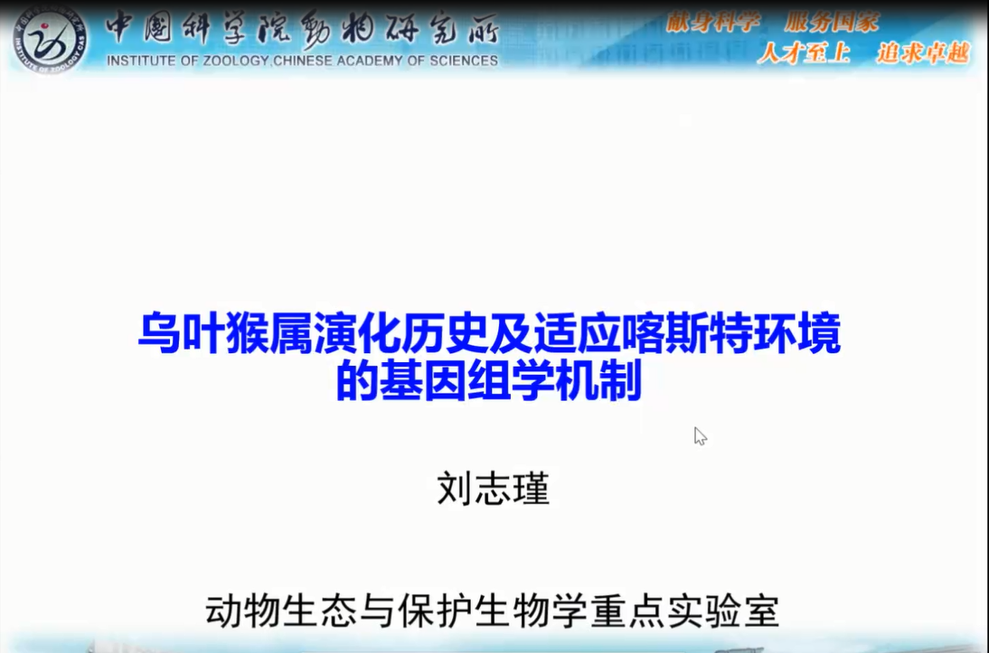 中國(guó)科學(xué)院動(dòng)物研究所劉志瑾副研究員詳述了烏葉猴屬中黑葉猴種組、銀葉猴種組、郁烏葉猴種組三個(gè)種組演化地位和種群動(dòng)態(tài)。并對(duì)石山葉猴和雨林葉猴兩大類群以及黑葉猴種組的分化情況進(jìn)行了深入闡述。研究最后推斷EDNRB基因是在自然選擇過(guò)程中,在白頭葉猴遺留下來(lái)的環(huán)境適應(yīng)性毛色表型的關(guān)鍵機(jī)制。劉老師的報(bào)告使相關(guān)領(lǐng)域?qū)W者對(duì)靈長(zhǎng)類生態(tài)分類群中的基因-環(huán)境相互作用和生理-形態(tài)適應(yīng)機(jī)制有了新的認(rèn)識(shí)。