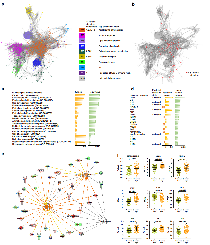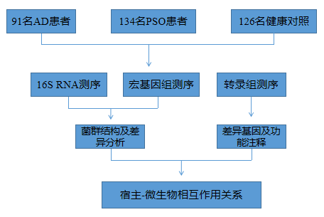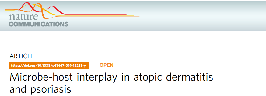 本文通過16S RNA測序、宏基因組測序及轉錄組測序技術研究了特異性皮炎和銀屑病患者皮膚微生物群落結構以及皮膚基因表達模式。發(fā)現(xiàn)特異性皮炎和銀屑病與健康對照皮膚微生物組成存在顯著差異。特異性皮炎以金黃葡萄球菌為主并與宿主皮膚屏障功能、色氨酸代謝和免疫激活相關。銀屑病皮膚微生物群落與宿主基因表達存在微弱的關聯(lián)性。并為皮膚生態(tài)失調的生物標志物和靶向治療提供基礎。