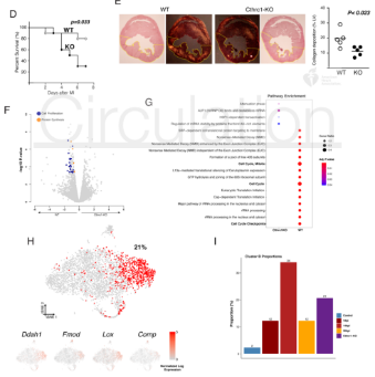 作者觀察到Cthrc1只在CF中而不在其他心肌細胞中表達,因此想要探討Cthrc1在CF中的功能作用。文中通過Cthrc1敲除小鼠(KO)研究發(fā)現在生長發(fā)育成年過程中大小、體積、心臟表型都沒有太大的變化,但是心肌梗死后KO小鼠的存活率顯著下降(80% WT vs 30% KO),這與KO梗塞心臟左心室游離壁膠原沉積的顯著減少有關。GO富集分析發(fā)現,與WT相比較,KO CF在MI 涉及到細胞分化、增殖以及蛋白合成信號通路富集有顯著性差異,并且通過TGF-β1誘導的KO CF在血管生成、肌肉收縮、血管系統(tǒng)發(fā)育等相關通路基因明顯下調,表明KO CF對TGF-β1反應調控能力降低。單細胞RNA測序進一步分析了4189個處于7dpi的KO CF,與WT相比較,RCF類的細胞百分比增加了(21% KO vs 14 WT)。RCF類的CF和其他活化CF的亞群(如POSTN +)都在Cthrc1-KO梗死小鼠的IZ和BZ中被發(fā)現了,這也就說明了心室破裂的表型來源于CTHRC1 的缺失。因此,Cthrc1的缺失與ECM組織、膠原生物合成和TGF-介導的調控有關的基因下調密切相關。這也證實了RCF通過分泌CTHRC1介導心臟修復影響ECM分子的沉積和合成,促進CF的增殖。