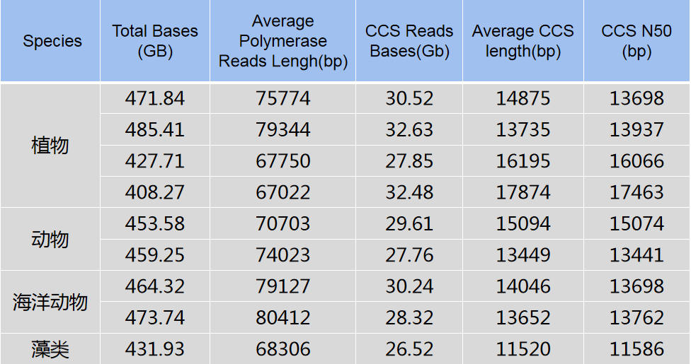 百邁客自2019年引進(jìn)PacBio SequelⅡ平臺(tái)以來(lái),在HiFi測(cè)序方面已經(jīng)積累了大量的經(jīng)驗(yàn),在技術(shù)人員的不斷優(yōu)化下,HiFi文庫(kù)單cell產(chǎn)出更是有了新的突破,下面跟大家分享一下部分HiFi文庫(kù)產(chǎn)出情況(表2)。在統(tǒng)計(jì)近1個(gè)月的HiFi cell中,我們單cell平均產(chǎn)出達(dá)416Gb。其中,單cell產(chǎn)出達(dá)400 Gb以上的占比達(dá)68%,同時(shí),單cell的HiFi reads數(shù)據(jù)量高達(dá)32 Gb,占原始產(chǎn)出的比例*高可達(dá)7.96%。在讀長(zhǎng)方面,平均酶讀長(zhǎng)已超70Kb,HiFi reads長(zhǎng)達(dá)18Kb。