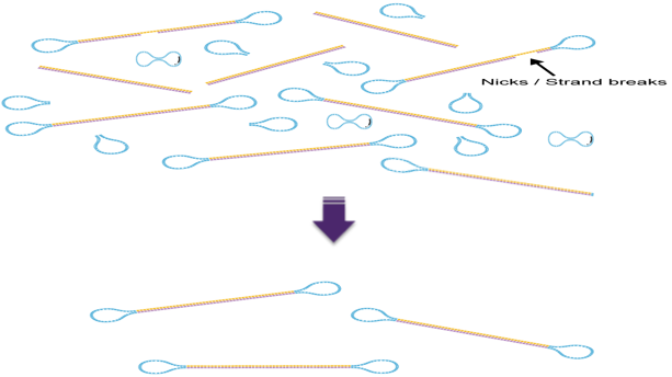 以基因組HiFi文庫(kù)為例(15-20K文庫(kù))(圖4)。當(dāng)?shù)玫絞DNA后,先利用G-tube管或Megaruptor System將基因組片段化至合適大小,而后通過(guò)去除單鏈懸突、損傷修復(fù)和末端修復(fù)等步驟,得到完整的雙鏈插入片段。接下來(lái),通過(guò)將接頭連接至雙鏈DNA來(lái)創(chuàng)建SMRTbell文庫(kù),從而得到環(huán)狀模板。完成接頭連接后,需要對(duì)連接產(chǎn)物進(jìn)行純化,利用酶處理(圖5)來(lái)消化線性或內(nèi)部損傷環(huán)形DNA分子(游離的Hairpin Adapter、兩端未連接Adapter的DNA模板、已成環(huán)但內(nèi)部有損傷的DNA模板),酶處理完畢后,一般會(huì)利用Bulepippin或Sage ELF System切膠回收目標(biāo)大小范圍內(nèi)的文庫(kù)。