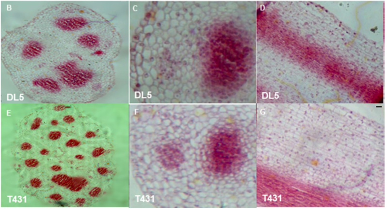 本研究利用石蠟切片法對其結(jié)構(gòu)變化及不育原因進行觀察,觀察不育材料T431(圖1E)與對照材料(圖1B)成熟花柱的橫切,可以看出不育材料T431花柱中的維管束數(shù)目多于對照材料。同時形態(tài)觀察時發(fā)現(xiàn)不育材料花柱直徑顯著大于對照材料,維管束數(shù)目的增多可能直接導(dǎo)致了不育材料花柱直徑變大(圖1C, D, F, G)。觀察成熟花柱的細胞發(fā)現(xiàn)不育材料與對照材料花柱細胞大小沒有顯著差別。因此說明不育材料花柱伸長是由花柱細胞數(shù)目增多導(dǎo)致而非細胞體積變大導(dǎo)致。