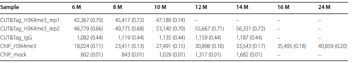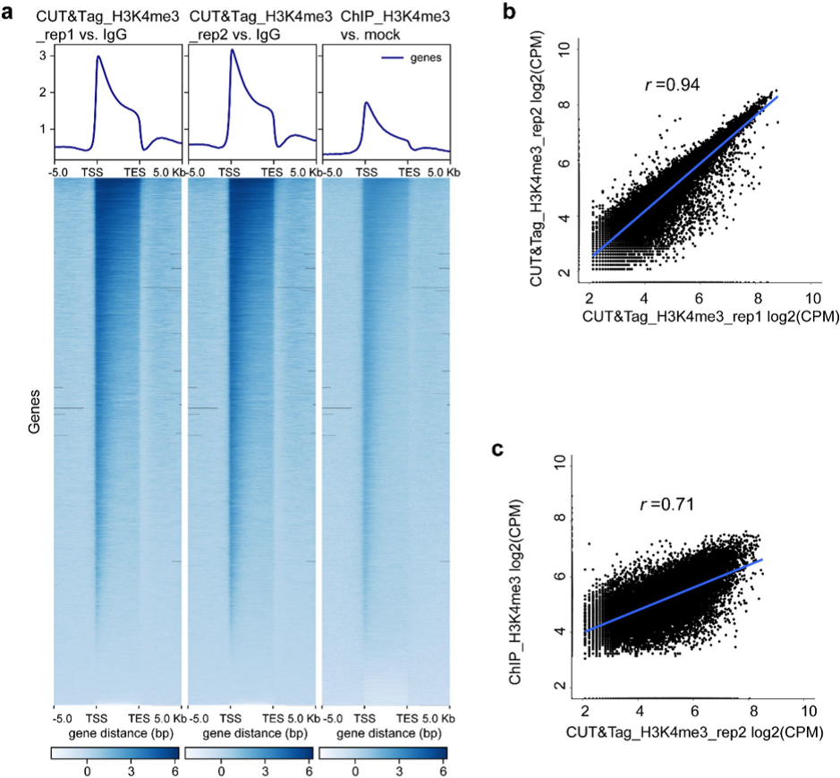 FRiP(fraction of reads in peaks)values calculated the ratio of mapped reads that fall into peaks among all mapped reads. FRiP值越高,信噪比越高,結果也越可靠。結果表明CUT&Tag產(chǎn)生的信噪比較高(FRiP=0.7;表1)。然而,從H3K4me3信號熱圖上可以看出,在整個gene body區(qū)域CUT&Tag的信號比ChIP-Seq更強(圖4,a)。從相關性分析的結果可以看出,基因附近的peaks在CUT&Tag兩個生物學重復之間相關性很高(r=0.94,pearson’s correlation;圖4,b),CUT&Tag和ChIP之間的相關性也較高(r=0.71,pearson’s correlation;圖4,c)。