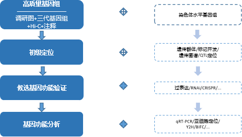 遺傳圖譜是目前經(jīng)典的功能基因定位策略,主要基于高通量測序技術(shù)開發(fā)單核苷酸多態(tài)性位點(SNP),并計算多態(tài)性標(biāo)記間的遺傳連鎖距離,構(gòu)建高密度遺傳圖譜,最后結(jié)合性狀調(diào)查對目標(biāo)區(qū)域進(jìn)行定位。數(shù)量性狀基因座(quantitative trait locus,QTL)是指基因組中引起數(shù)量性狀變異的座位。作物的產(chǎn)量、質(zhì)量、株型、生長發(fā)育等大多數(shù)重要經(jīng)濟(jì)性狀及農(nóng)藝性狀通常都為數(shù)量性狀。利用分子標(biāo)記,通過連鎖分析進(jìn)行QTL定位,是遺傳學(xué)中研究數(shù)量性狀相關(guān)功能基因的基本手段和確定分離并分離目標(biāo)基因的前提。而優(yōu)質(zhì)的基因組才能為性狀精準(zhǔn)定位提供有力支持。