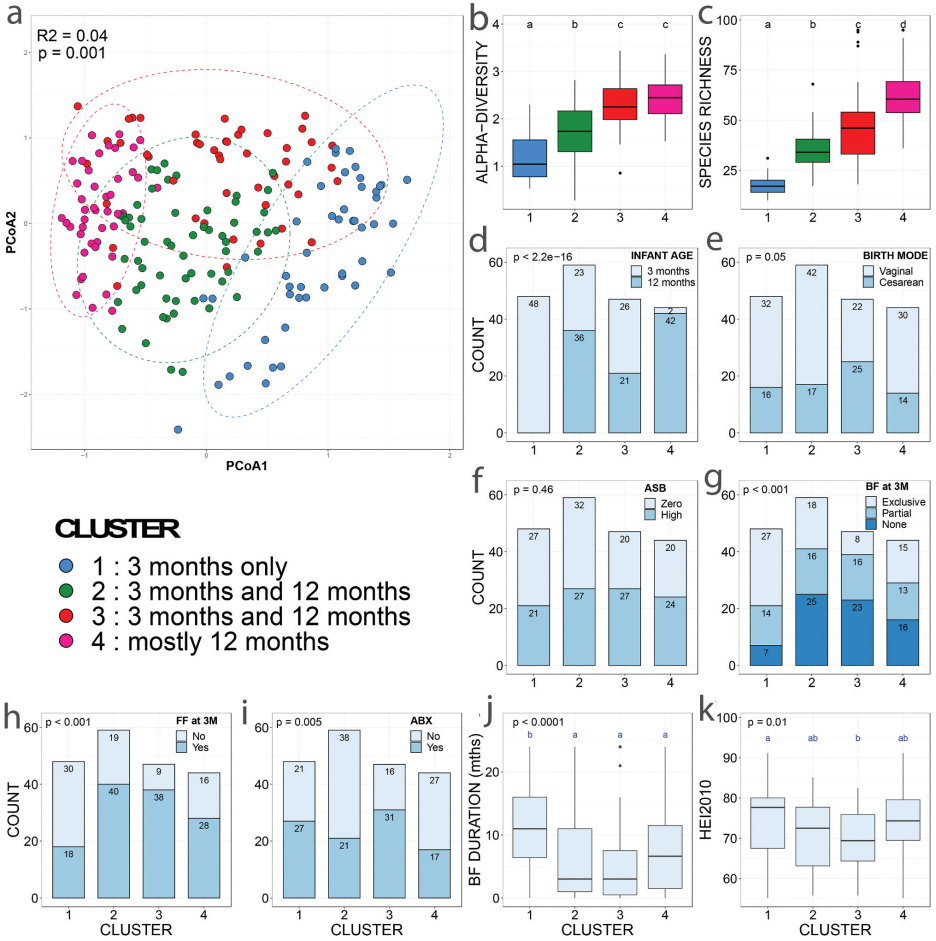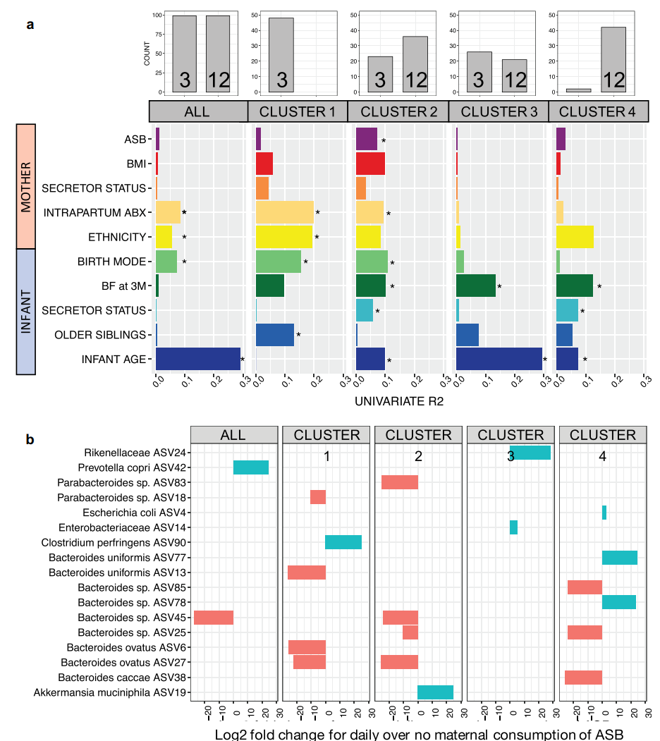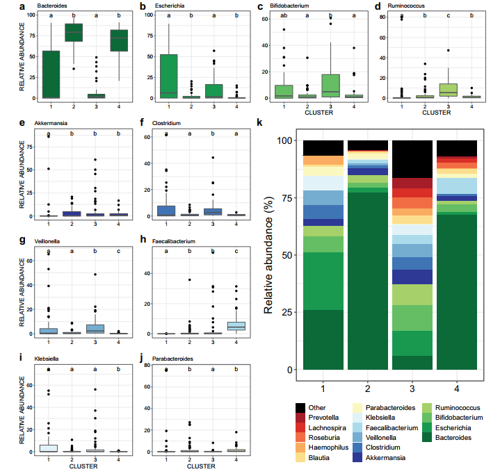基于微生物群落組成,嬰兒糞便樣品聚類成四組(圖1-2)。腸道細菌物種豐富度(圖1b)、alpha(圖1c)、beta(圖1a)和分類學(xué)組成(圖2)在clusters之間存在差異,反應(yīng)了顯著的菌落差異。Cluster1僅包含了3個月的樣本、cluster4幾乎包括所有12個月的樣本,cluster2和3由3個月和12個月的樣本混合組成。Cluster3包括較高比例的分娩時期使用抗生素的母親、剖腹產(chǎn)出生的嬰兒和配方奶粉喂養(yǎng)(圖1)。然而,在不同clusters中母親ASB消耗量沒有差異,這表明這種暴露并不影響clusters的分類(圖1f)。