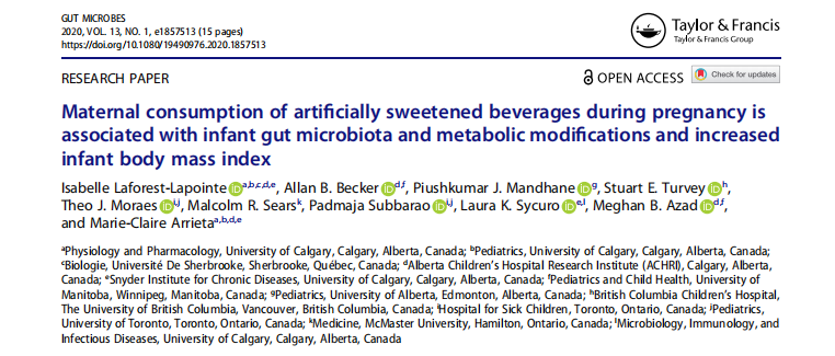 英文名稱:Maternal consumption of artificially sweetened beverages during pregnancy is associated with infant gut microbiota and metabolic modifications and increased infant body mass index