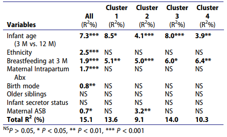 接下來,作者對不同cluster進行了beta多樣性分析。Envfit單變量模型為每個cluster確定了不同的驅(qū)動因素(圖3a)。Cluster1中beta多樣性的驅(qū)動因素主要是母親因素,而cluster4的驅(qū)動因素主要是嬰兒因素(圖3a)。Cluster2是唯一的母親ASB攝入與beta多樣性相關(guān),單變量分析和多變量分析均得到證實(圖3a和表2)。