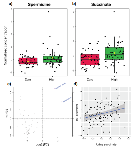 使用MetaboAnalyst軟件確定了20種不同的代謝物。由于代謝組中的功能特征反應(yīng)了微生物代謝的冗余性,并且不太容易受到分類學(xué)數(shù)據(jù)集典型個體間差異的影響,作者測試了3個月和12個月時母親ASB消耗量對完整數(shù)據(jù)顯著的影響。兩種尿液代謝物亞精胺和琥珀酸在暴露于ASB的3個月嬰兒中顯著升高(圖4)。