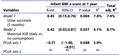 最后,在完整數(shù)據(jù)集上使用一個多變量線性模型,作者測試了母親ASB消耗量、微生物群落組成、與高ASB消耗量關(guān)聯(lián)的兩種代謝物與1歲嬰兒BMI z-score間的關(guān)系。此隊列中嬰兒出生時體重與一歲時的BMI沒有相關(guān)性。然而,多變量線性模型證實母親ASB日消耗量與嬰兒較高的BMI相關(guān),并表明BMI與12個月時微生物組成有關(guān)但與3個月時無關(guān)(表3)。值得注意的是,琥珀酸與BMI呈正相關(guān),與亞精胺無關(guān),表明這種關(guān)聯(lián)也可能涉及微生物來源的代謝物(表3和圖4d)。