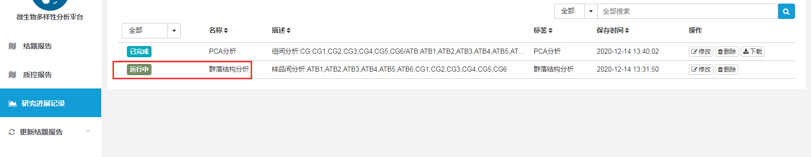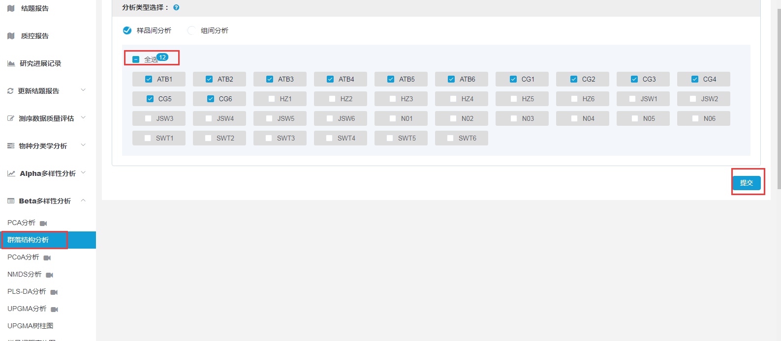 云平臺上關(guān)于群落結(jié)構(gòu)分析的操作非常簡單,打開結(jié)題報告后點擊“Beat多樣性分析”中的群落結(jié)構(gòu)分析,選中需要分析的樣品點擊提交,然后可以在分析記錄界面查看分析結(jié)果(由于會做999次重復計算,大家耐心等待哦)。