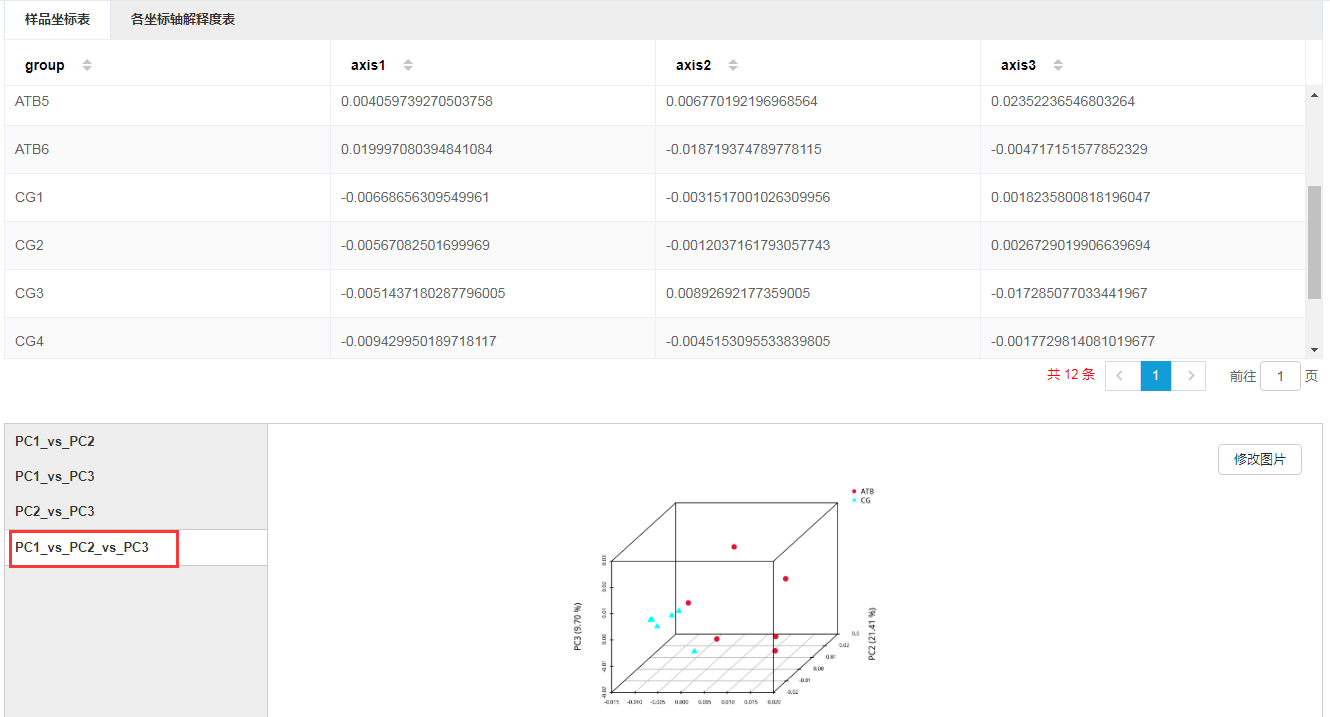 PCA/PCoA分析通常使用第一軸和第二軸的信息展示樣品或者分組之間的聚集和差異,當?shù)谝惠S和第二軸不足以展示組間差異時,我們可以通過三維圖查看前3軸對樣品間差異的影響。打開結(jié)題報告后點擊“Beat多樣性分析”中的PCA分析或者PCoA分析,選中樣品或者分組,提交任務后會顯示三維分析結(jié)果。