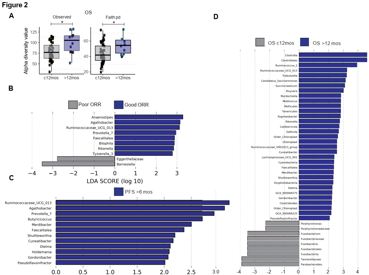 作者檢測的隊列中所有患者alpha多樣性在OS>12個月和OS<12個月的患者之間差異不顯著。依據(jù)臨床數(shù)據(jù)比較了組間GM的組成。在PFS>6個月的患者中,Ruminococcaceae UCG 13 和?Agathobacter富集。在OS>12個月的患者中Lachnospiraceae UCG 001富集。