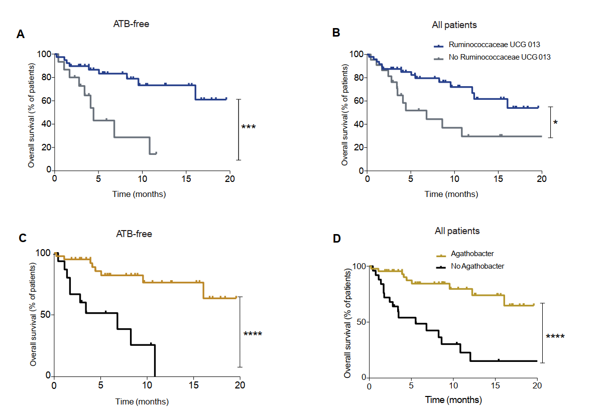 由于ATB的使用顯著改變了GM的組成,作者通過排除接受ATB治療的患者來描述GM組成。在無ATB組,alpha多樣性降低與較短的OS有關(guān)(圖2A)。在beta多樣性分析中沒有發(fā)現(xiàn)不同的clusters。Ruminococcaceae UCG 13和Agathobacter在具有良好ORR和PFS>6個月的個體中富集(圖2B和2C)。Ruminococcaceae UCG 13在OS>12個月的患者中富集(圖2D)。在未接受ATB治療的患者中,Clostridiales order在OS>12個月的患者中富集(圖2D)。