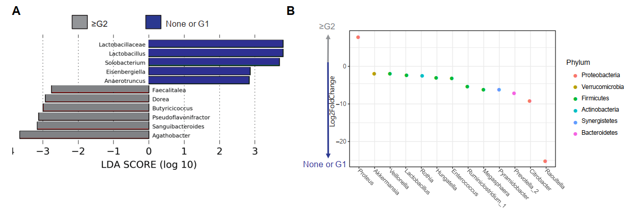 考慮到GM與irAE之間的可能存在聯(lián)系,作者分析了經(jīng)歷臨床相關(guān)irAE的患者(>2級)和不嚴(yán)重的irAE患者(1級或無)之間的GM組成間的差異。在未接受ATB治療的患者和所有患者中,組間的細(xì)菌多樣性沒有差異。LEfSe分析中Lactobacillaceae和DESeq2分析中Raoultella?在未經(jīng)歷嚴(yán)重irAE患者糞便中富集(圖4A和4B)。盡管Akkermensia與改善的臨床結(jié)果無關(guān),但是其與較輕的irAE相關(guān)(圖4B)。