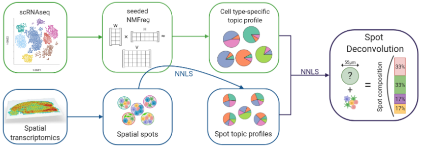?現(xiàn)在10x Visium數(shù)據(jù)基礎(chǔ)的分析思路是將每個spot看作一個細(xì)胞,然后參考單細(xì)胞轉(zhuǎn)錄組的分析思路進(jìn)行分析。但是現(xiàn)在的實驗中,單個spot中包含不僅是一個細(xì)胞。如何確定每個spot中包含的細(xì)胞,對于空間轉(zhuǎn)錄組的分析是有幫助的。SPOTlight可以結(jié)合單細(xì)胞RNA測序信息反卷積空間數(shù)據(jù),識別每個spot中的細(xì)胞類型和比例。