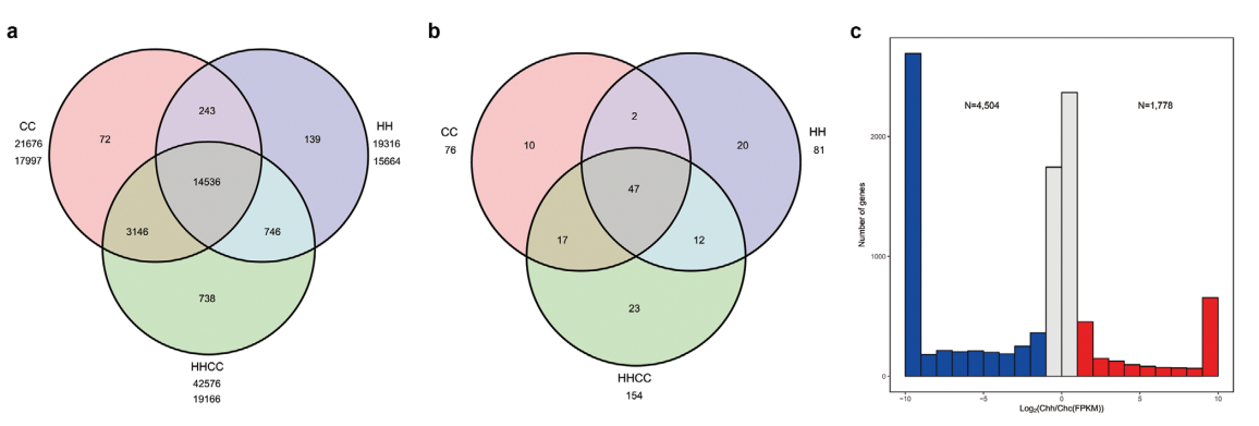 與已測(cè)序的栽培黃瓜基因組一樣,金瓜中大部分的TE為長(zhǎng)末端重復(fù)序列。C.×hytivus(S14)的Chc亞基因組(SubC)含有的TEs少于二倍體C.sativus(CC)基因組,而Chh亞基因組(SubH)保持了幾乎相同的不同類型TEs的含量和比例。共預(yù)測(cè)了45687個(gè)基因,平均基因長(zhǎng)3846bp,每個(gè)基因有5.26個(gè)外顯子。BUSCO評(píng)估結(jié)果為90.90%,CEGMA評(píng)估結(jié)果為97.82%。在CC和HH二倍體基因組中鑒定的18882個(gè)同源基因家族中,在C.×hytivus(S14)異源四倍體中也鑒定了18428個(gè)(97.60%)(圖2)。