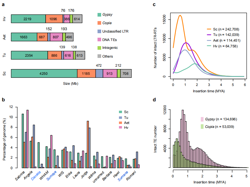 與烏拉爾圖小麥、節(jié)節(jié)麥及大麥的LTR-RTs進行比較發(fā)現(xiàn):(1)Gypsy是威寧黑麥基因組擴張的主要原因之一(Fig. 2a),并且有3個LTR-RT家族(Daniela, Sumaya, Sumana)在威寧黑麥中特異擴張,其中Daniela的占比最高 (Fig. 2b)。(2)威寧黑麥中完整的LTR-RTs插入時間存在獨特的雙峰分布(Fig. 2c),最近一個擴增峰出現(xiàn)在50萬年前,另出現(xiàn)在1.7 百萬年(MYA)左右(與大麥相同) (Fig. 2c)。(3)這種雙峰分布模式由Gypsy?RTs的擴增主導(dǎo)(Fig. 2d)。