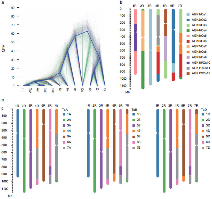 通過比較威寧黑麥、烏拉爾圖小麥、節(jié)節(jié)麥、普通小麥(亞基因組TaA、TaB和TaD)、大麥、水稻Os(Oryza sativa ssp.?japonica)、二穗短柄草Bd(Brachypodium distachyon)、玉米Zm(Zea mays)、高粱Sb(Sorghum bicolor)、谷子Si(Setaria italica)基因組,共找到2517個單拷貝同源基因。通過對單拷貝基因組構(gòu)建進化樹和計算分化時間發(fā)現(xiàn),在大麥和小麥分化后(15MYA)黑麥和二倍體小麥發(fā)生了分化(9.6 MYA) (Fig. 3a)。
