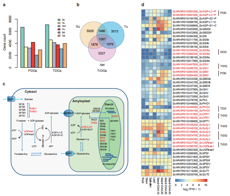 接下來作者研究了黑麥淀粉生物合成相關(guān)基因(SBRGs)中的基因復(fù)制。研究發(fā)現(xiàn)這些重復(fù)類型在黑麥淀粉生物合成相關(guān)基因(SBRGs)中普遍存在,并且不同的SBRG的復(fù)制基因之間往往表現(xiàn)出表達差異,說明不同類型的基因復(fù)制可以豐富黑麥基因在重要生物過程中的遺傳多樣性(圖4c),這些黑麥SBRGs的新變化可能為調(diào)控植物淀粉生物合成和性質(zhì)提供新的酶活性,因此解析全套黑麥SBRGs有利于提高黑麥的產(chǎn)量潛力和營養(yǎng)品質(zhì)。