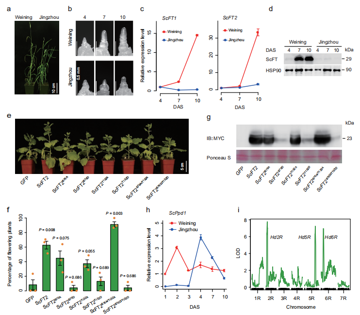 在長日照條件下,威寧黑麥比荊州黑麥提前抽穗10-12天(圖6a),這與威寧黑麥莖尖分生組織發(fā)育更快有關(guān)(圖6b)。在威寧黑麥基因組中,注釋到在長日照條件下高表達的兩個開花位點(FT)基因ScFT1(ScWN4R01G446100)和ScFT2(ScWN3R01G192500)。播種后7天和10天,ScFT1和ScFT2在威寧黑麥中的表達水平顯著高于荊州黑麥(圖6c),且ScFT蛋白在黑麥中積累到相對較高水平,而荊州黑麥中幾乎沒有(圖6d)。檢測到的ScFT蛋白的大?。▇29 kDa)比預(yù)測出的ScFT1和ScFT2的分子量大(~19 kDa)(圖6d),表明ScFT蛋白具有潛在的翻譯后修飾。用高效檢測磷蛋白的磷酸標(biāo)記SDS-PAGE分析表明,威寧黑麥中ScFT確實發(fā)生了翻譯后磷酸化修飾。