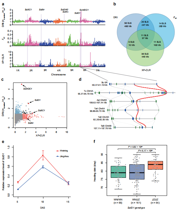 對馴化基因的分析可以促進對作物性狀的理解和改良,但在黑麥中這類基因的分子分析方面進展甚微。作者通過全基因組選擇清除分析,利用在栽培黑麥和瓦維洛夫黑麥(S. vavilovii)之間鑒定的123647個SNPs,挖掘黑麥馴化相關(guān)染色體區(qū)域和基因座。DRI、FST、XP-CLR分析中,共同識別到11個選擇信號(圖7a-c)。通過與水稻和大麥的共線性比較,發(fā)現(xiàn)了一些可能的選擇清除位點,包括已在水稻或大麥中已被功能分析的ScBC1、ScBtr、ScGW2、ScMOC1、ScID1和ScWx的同源基因(圖7a-c)。