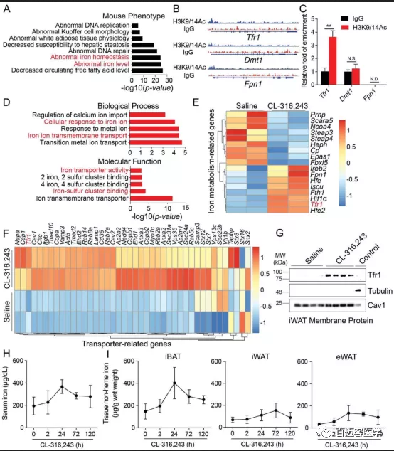 本研究首先利用Chip-seq (Fig 1A/B)、RNA-seq(Fig 1D/E)、蛋白組三種技術(shù)手段,從轉(zhuǎn)錄調(diào)控、mRNA、蛋白質(zhì)三個不同層面發(fā)現(xiàn)在實驗組(C57BL/6J mice)中與鐵轉(zhuǎn)運相關的啟動子 、基因、蛋白均有明顯的富集。為了驗證結(jié)果的準確性,對與鐵轉(zhuǎn)運相關的啟動子進行用Chip-qPCR(Fig 1C)的方法驗證,對鐵轉(zhuǎn)運相關的蛋白做了WB驗證(Fig 1G),結(jié)果都顯示Tfr1基因在實驗組(C57BL/6J mice)中的表達量明顯增加。綜上所述,Tfr1基因在CL-316,243處理的小鼠中Tfr1基因?qū)﹁F穩(wěn)態(tài)起著至關重要的作用。
