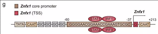 為了確定哪些核苷酸和區(qū)域Znfx1轉(zhuǎn)錄中很重要,使用promoter 2.0( http://www.cbs.dtu.dk/services/promoter/)、JASPAR(http://jaspar.genereg.net/)和CpGplot(http://www.ebi.ac.uk/Tools/seqstats/emboss_cpgplot/)進(jìn)行識別,其中包含TATA框、GC框和CAAT框的Znfx1的-1,064~+63之間的區(qū)域,是啟動子。對轉(zhuǎn)錄因子結(jié)合位點(diǎn)的進(jìn)一步分析表明,Znfx1的啟動子在相對集中和重疊的區(qū)域中包含STAT1、STAT2、IRF1和IRF9結(jié)合基序?;谶@些分析,構(gòu)建了一個(gè)Znfx1啟動子報(bào)告基因載體,包含?1,064~+63之間的區(qū)域,以及一個(gè)突變的報(bào)告基因構(gòu)建體,其中缺失了STAT1、STAT2、IRF1和IRF9結(jié)合motif。接下來,STAT1,STAT2,IRF1或IRF9過表達(dá)質(zhì)粒和2個(gè)報(bào)告基因載體轉(zhuǎn)染293T細(xì)胞,報(bào)告基因分析表明,在STAT1、STAT2、IRF1或IRF9存在的情況下,報(bào)告基因的表達(dá)可以由Znfx1啟動子誘導(dǎo),而不能由缺少轉(zhuǎn)錄因子結(jié)合位點(diǎn)的啟動子載體誘導(dǎo)(圖1l)。總而言之,ZNFX1是一個(gè)ISG,其病毒感染后的上調(diào)取決于JAK1-STAT1級聯(lián)反應(yīng)。