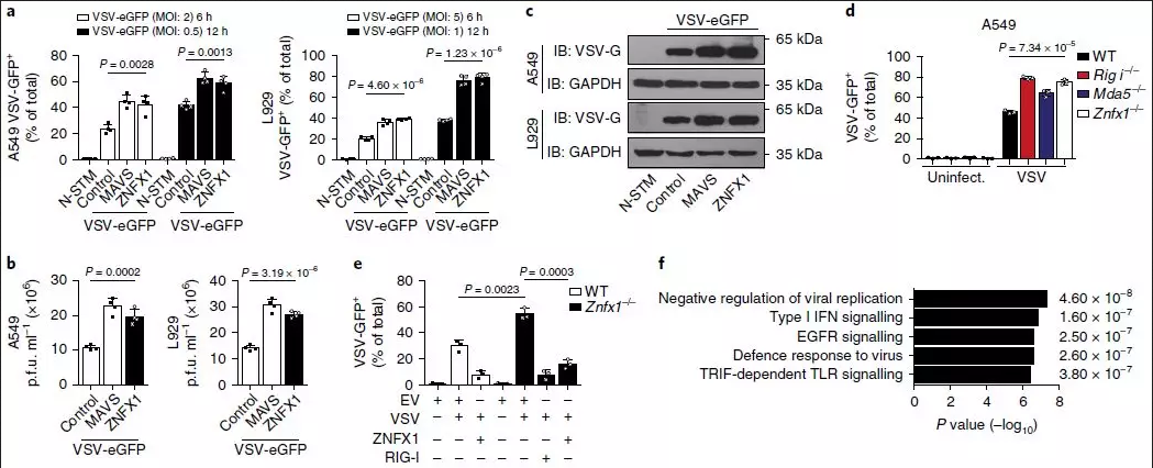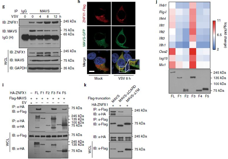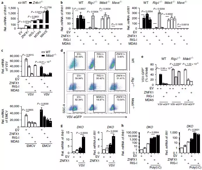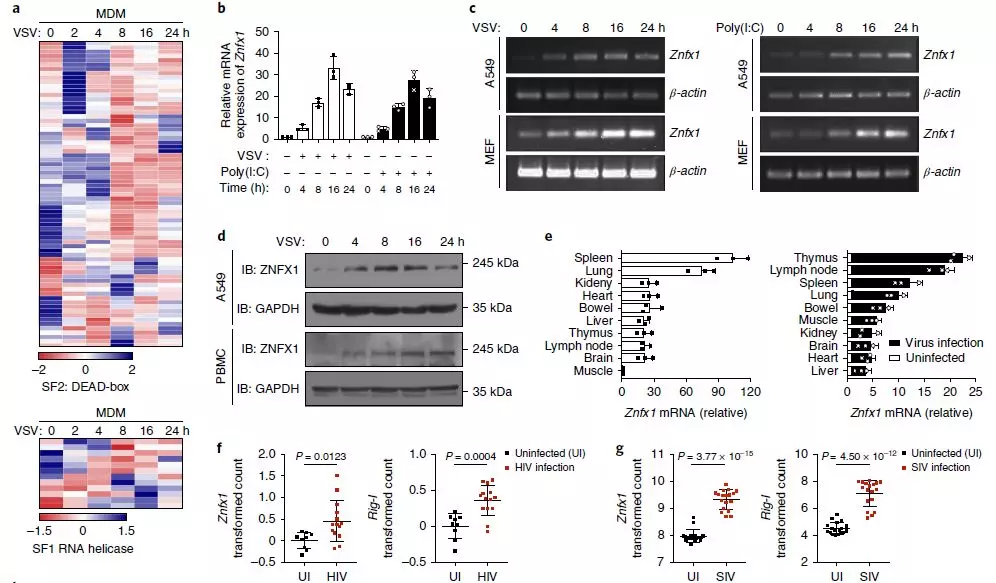 為了更深入地了解ZNFX1在抗病毒應(yīng)答中的作用,進(jìn)行了qRT-PCR或免疫印跡分析,以了解VSV感染或干擾素誘導(dǎo)劑聚肌胞苷酸(poly(I:C))刺激A549細(xì)胞、外周血單個(gè)核細(xì)胞(PBMC)或小鼠胚胎成纖維細(xì)胞(MEF)細(xì)胞后ZNFX1的表達(dá)上調(diào)(圖1b–d)。qRT-PCR也證實(shí)了靜脈注射VSV后小鼠脾臟和肺中Znfx1的豐度上調(diào)(包括胸腺、淋巴結(jié)脾臟和肺)(圖1e)。作者還對先前收集的芯片數(shù)據(jù)集(GDS4231/4214/1271/3210/6082/6063)進(jìn)行了統(tǒng)計(jì)分析,發(fā)現(xiàn)與健康對照相比,在HIV感染患者和猿猴免疫缺陷病毒(SIV)引起的腦炎猴子中,Znfx1的RNA水平明顯更高(圖1f,g)。此外,在不同的細(xì)胞類型(包括巨噬細(xì)胞、樹突狀細(xì)胞和上皮細(xì)胞)中感染病毒后,Znfx1的轉(zhuǎn)錄顯著增加。這些數(shù)據(jù)都表明ZNFX1可能是抗病毒分子。