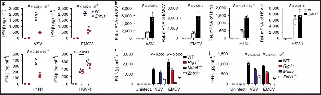 為了研究ZNFX1在體內(nèi)的生理作用,使用CRISPR/Cas系統(tǒng)生成了Znfx1-/-C57BL/6J小鼠。Znfx1-/-小鼠存活,沒有明顯的生理或行為異常。在這項(xiàng)研究中使用了六至八周大的小鼠。首先,分離野生型和Znfx1-/-小鼠的BMDM并用VSV、EMCV、H1N1或HSV-1感染,與野生型相比,Znfx1-/-BMDM的IFN-α或IFN-β分泌較低。RNA病毒感染后,包括VSV、EMCV和H1N1,但不包括HSV-1(圖2g),Znfx1-/-BMDM中檢測到較高的病毒mRNA水平,但在HSV-1感染的細(xì)胞中未檢測到較高的病毒mRNA水平(圖2h)。與野生型相比,Znfx1-/- MEF和A549細(xì)胞在RNA病毒感染VSV和EMCV后表現(xiàn)出較低的IFN-β分泌(圖2i,j)。