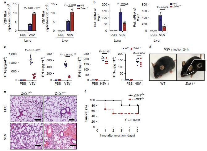 ZNFX1在宿主體內(nèi)對抗病毒感染的防御中的重要性:通過尾靜脈向野生型和Znfx1-/-小鼠注射了VSV。與野生型小鼠相比,Znfx1-/-小鼠的肺和肝中的VSV復(fù)制增強(qiáng)了(圖3a),隨著肺和肝中Ifnb1表達(dá)的減少,在Znfx1-/-小鼠中血清中IFN-α和IFN-β的分泌降低(圖3b,c)。而HSV-1感染后,Znfx1-/-和野生型小鼠之間血清中的IFN-α和IFN-β沒有差異(圖3c)。有趣的是,VSV感染一天后,Znfx1-/-小鼠中有80%患有結(jié)膜炎,這是VSV感染的早期癥狀(圖3d)。另外,觀察到VSV感染后炎性細(xì)胞更多地滲透到Znfx1-/-小鼠的肺中(圖3e),并且Znfx1-/-小鼠在存活試驗(yàn)中對VSV感染的抵抗力較弱(圖3f)。這些數(shù)據(jù)表明,Znfx1缺乏后體內(nèi)產(chǎn)生較少的I型IFN,削弱了針對RNA病毒感染的先天免疫反應(yīng)。總之,ZNFX1專門針對RNA病毒發(fā)揮其抗病毒特性。
