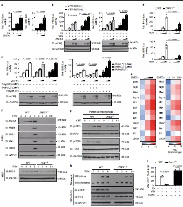 為了研究ZNFX1在IFN信號傳導(dǎo)中的作用,通過ZNFX1過表達(dá)質(zhì)粒和Ifnb1-reporter或IFN刺激的應(yīng)答元件(ISRE)報(bào)告質(zhì)粒瞬時(shí)轉(zhuǎn)染A549細(xì)胞進(jìn)行螢光素酶報(bào)告基因分析,然后進(jìn)行或不進(jìn)行VSV感染。結(jié)果表明,ZNFX1的過表達(dá)輕微激活了Ifnb1啟動子和ISRE報(bào)告基因(圖4a)。此外,ZNFX1以劑量依賴的方式顯著增強(qiáng)了由VSV、2種類型的poly(I:C)或poly(dA:dT)觸發(fā)的Ifnb1啟動子激活(圖4b,c)。相反,敲除Znfx1可降低VSV誘導(dǎo)的293T細(xì)胞中Ifnb1報(bào)告基因和ISRE報(bào)告基因的激活(圖4d)。Ifnb1和ISGs的轉(zhuǎn)錄以劑量和時(shí)間依賴性的方式誘導(dǎo)(圖4e),當(dāng)ZNFX1在A549細(xì)胞中過表達(dá)時(shí)隨著劑量和時(shí)間增強(qiáng)反之敲除ZNFX1則降低。而與野生型細(xì)胞相比,Znfx1-/-A549和MEF細(xì)胞中ISG蛋白表達(dá)量分別減少(圖4f)。VSV感染后Znfx1-/-巨噬細(xì)胞中TBK1和IRF3的磷酸化低于野生型巨噬細(xì)胞(圖4g)。在VSV感染的Znfx1-/-293T細(xì)胞中,IRF3的二聚化也低于野生型細(xì)胞(圖4h)。野生型A549細(xì)胞中觀察到了VSV的限制性復(fù)制,但在Ifnar1-/-A549細(xì)胞中未觀察到(圖4i)。所有這些數(shù)據(jù)表明,ZNFX1通過誘導(dǎo)I型IFN的產(chǎn)生而參與抗病毒免疫反應(yīng),其抗病毒特性也取決于IFN信號傳導(dǎo)。