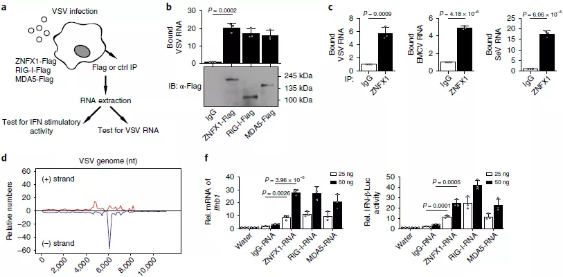 屬于RNA解旋酶SF2的許多基因被鑒定為結(jié)合病毒RNA的RNA病毒傳感器,因此假設(shè)屬于SF1的ZNFX1也可能作為RNA傳感器結(jié)合病毒RNA。為證實(shí)這一假設(shè),首先在293T細(xì)胞中過表達(dá)ZNFX1,然后進(jìn)行pulldown和qRT-PCR分析以確定ZNFX1與VSV-RNA的高結(jié)合能力(圖5a,b)。也檢測了內(nèi)源性ZNFX1與A549細(xì)胞中的VSV,EMCV和仙臺病毒(SeV)RNA的結(jié)合能力(圖5c)。通過用抗內(nèi)源性ZNFX1的抗體從免疫沉淀物中分離RNA來進(jìn)行RNA免疫沉淀(RIP)測序分析,將ZNFX1相關(guān)的RNA比對到VSV基因組(圖5d),優(yōu)先定位于約6,000-8,000 nt的VSV片段(圖5e)。值得注意的是,當(dāng)與ZNFX1相關(guān)的RNA轉(zhuǎn)染到A549細(xì)胞中時(shí),通過qRT-PCR和熒光素酶活性分析觀察到了Ifnb1的誘導(dǎo)轉(zhuǎn)錄和基于Ifnb1啟動子的報(bào)告基因的誘導(dǎo)表達(dá)(圖5f)。