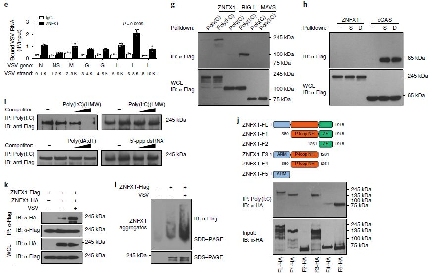 為了進(jìn)一步評估與ZNFX1結(jié)合的病毒RNA的性質(zhì),首先將核酸類似物連接的磁珠與經(jīng)Flag標(biāo)記的ZNFX1、RIG-I或MAVS過表達(dá)的293T細(xì)胞裂解液一起孵育,并進(jìn)行了pulldown試驗(yàn)以顯示ZNFX1和RIG-I蛋白與poly(I:C)結(jié)合,但不與poly(C)結(jié)合(圖5g)。cGAS而非ZNFX1結(jié)合單鏈和雙鏈DNA(ISD,一個(gè)45 bp的雙鏈DNA;圖5h)。競爭實(shí)驗(yàn)顯示ZNFX1蛋白與HMW poly(I:C)優(yōu)先結(jié)合,而不是與LMW poly(I:C)、poly(dA:dT)或5’pppdsRNA優(yōu)先結(jié)合(圖5i)。為了找到ZNFX1的poly(I:C)結(jié)合位點(diǎn),準(zhǔn)備了ZNFX1的截短版本并進(jìn)行了poly(I:C) pulldown實(shí)驗(yàn)。結(jié)果表明,ZNFX1與poly(I:C)的結(jié)合需要ARM域和P環(huán)結(jié)構(gòu)域,而不是ZF鋅指域(圖5j)。病毒感染后ZNFX1的寡聚化增強(qiáng)(圖5k,1)。因此,ZNFX1充當(dāng)RNA病毒傳感器,它傾向于結(jié)合長RNA分子。