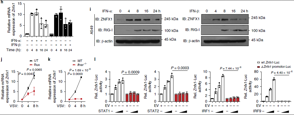 由于病毒感染導(dǎo)致ZNFX1的mRNA和蛋白質(zhì)水平表達(dá)均增強(qiáng),接下來通過將A549細(xì)胞與人重組IFN-α和IFN-β一起孵育來檢測ZNFX1是否為ISG。qRT-PCR和免疫印跡分析的結(jié)果表明ZNFX1的表達(dá)可以被IFN-α和IFN-β誘導(dǎo)(圖1h,i)。相比之下,JAK1抑制劑魯索替尼(ruxolitinib)可以抑制VSV對Znfx1 mRNA的誘導(dǎo),并且在Ifnar1-/-A549細(xì)胞中幾乎消失(圖1j,k)。