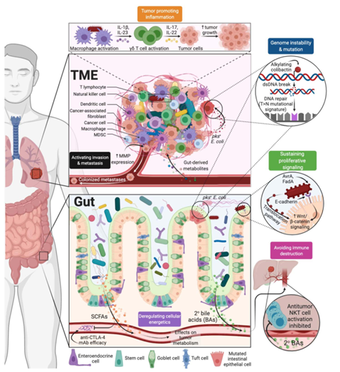 腸道中存在許多的微生物,它們是宿主能量獲取的關(guān)鍵中介,并且能將膳食營養(yǎng)素代謝為許多的生物活性物質(zhì),從而作為溝通腸道菌群與宿主相互作用的橋梁。腸道菌群由宿主基因、免疫應(yīng)答及飲食因素調(diào)控,而腸道菌群的代謝和免疫潛能決定了其在宿主健康和疾病中的重要意義。研究表明,腸道微生物紊亂與多種疾病的發(fā)生密切相關(guān),比如消化系統(tǒng)疾病、內(nèi)分泌系統(tǒng)疾病、精神系統(tǒng)疾病、自身免疫性疾病以及一些感染性疾病?;谶@些影響,人們越來越關(guān)注通過微生物靶向治療癌癥和其他疾病。