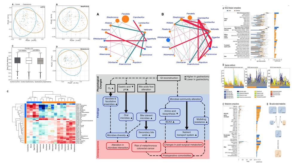 最近的證據(jù)表明,腸道微生物組參與了術(shù)后結(jié)果,包括胃切除術(shù)后。該研究對有胃癌切除史患者(n=50)和健康個(gè)體(n=56)的糞便樣本的宏基因組測序和代謝組學(xué)分析結(jié)果進(jìn)行對比分析。結(jié)果表明,胃切除術(shù)后不僅改變了患者糞便中微生物(如需氧菌和兼性厭氧菌等)群落構(gòu)變化,也改變了微生物功能特征,如營養(yǎng)物質(zhì)運(yùn)輸和有機(jī)化合物生物合成;胃切除術(shù)后患者體內(nèi)代謝物發(fā)生變化,如兩組間的基因毒性脫氧膽酸和支鏈氨基酸等膽汁酸含量存在差異,此外部分結(jié)直腸癌相關(guān)菌在胃切除術(shù)后患者中表現(xiàn)出相似模式,如具核梭桿菌在全胃切除術(shù)后患者中明顯富集。結(jié)果揭示了胃切除術(shù)后腸道微生物群的改變,提示其與術(shù)后并發(fā)癥相關(guān)。