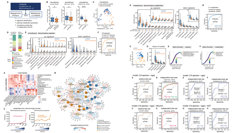 研究表明,腸道菌群失調(diào)與非酒精性脂肪性肝病(non-alcoholicfatty liver disease, NAFLD)進(jìn)展為晚期纖維化和肝硬化密切相關(guān)。為了進(jìn)一步確定上述關(guān)聯(lián)在臨床上的診斷能力,研究比較了163名來自對照和患病家庭成員的糞便微生物組,包括非NAFLD患者、NAFLD合并肝硬化患者及其一級親屬。通過對宏基因組和非靶向代謝組使用隨機(jī)森林機(jī)器學(xué)習(xí)算法和差異豐度分析,確定了用于檢測肝硬化有效的獨(dú)立的宏基因組和代謝組標(biāo)志物,診斷準(zhǔn)確率(AUC) 可達(dá)0.91。結(jié)合年齡和血清蛋白水平的宏基因組特征,可準(zhǔn)確區(qū)分在生理上和遺傳上不同的隊(duì)列中的肝硬化。該研究發(fā)現(xiàn)的這種通用的腸道微生物組衍生的標(biāo)志物,可以準(zhǔn)確地識別肝硬化,這在醫(yī)療資源有限的情況下對改善疾病診斷具有巨大的潛力。