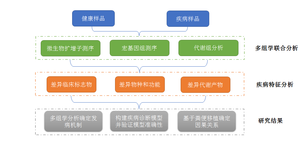 以上三篇案例都基于大樣本量(≥100)的宏基因組結(jié)合多組學(xué)的方法研究腸道菌群與疾病之間復(fù)雜的相互作用,總結(jié)研究流程如下: