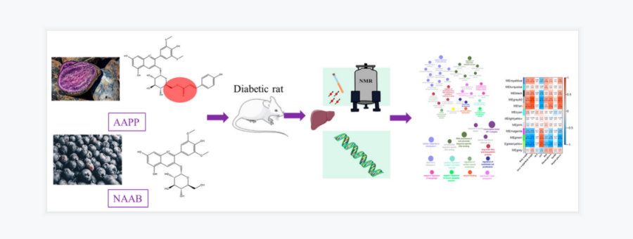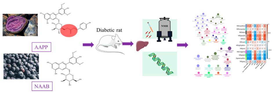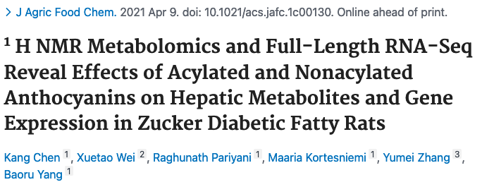 花色苷是植物中的一大類多酚化合物,目前已知是對(duì)氧化應(yīng)激、炎癥和能量穩(wěn)態(tài)有調(diào)節(jié)作用。已有報(bào)道發(fā)現(xiàn)花色苷具有抗糖尿病的療效?;ㄉ盏暮诵慕Y(jié)構(gòu)是花青苷,它可以糖基化形成非?;幕ㄇ嘬眨擒湛梢怎;笮纬甚;幕ㄇ嘬?。且最近有研究表明,與未?;幕ㄇ嘬障啾龋;ㄇ嘬站哂懈玫姆€(wěn)定性和抗氧化活性。本研究利用全長轉(zhuǎn)錄組學(xué)和核磁共振代謝組學(xué)方法,比較了非?;王;ㄉ諏?duì)糖尿病大鼠肝臟基因表達(dá)和代謝的影響。這是第一次綜合應(yīng)用這兩種強(qiáng)大的技術(shù)來研究肝臟基因表達(dá)和代謝產(chǎn)物的變化。