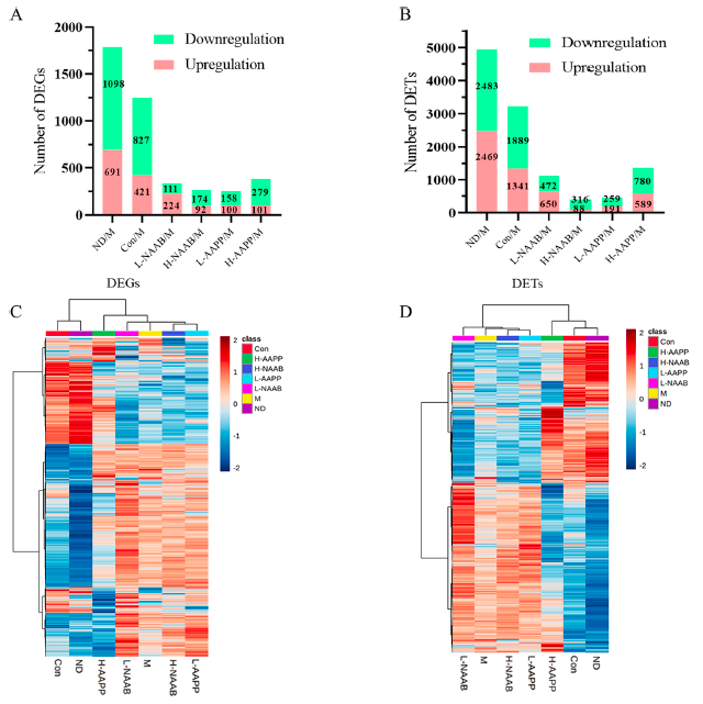 對(duì)全長轉(zhuǎn)錄組數(shù)據(jù)進(jìn)行分析發(fā)現(xiàn),在6個(gè)不同組之間的差異分析結(jié)果中,健康對(duì)照組和糖尿病模型之間有691個(gè)上調(diào)和1098個(gè)下調(diào)的DEGs,2469個(gè)上調(diào)和2483個(gè)下調(diào)的DETs (圖1A和B)。與M組相比,H-AAPP處理改變了最多的基因和轉(zhuǎn)錄本(101個(gè)上調(diào)和179個(gè)下調(diào)的DEGs,89個(gè)上調(diào)和780個(gè)下調(diào)的DETs)。DEGs和DETs的熱圖顯示,ND組和CON組在基因表達(dá)模式上與M組有很大不同,而且H-AAPP組的轉(zhuǎn)錄組圖譜似乎比M組更接近ND組和CON組(圖1C和D)。