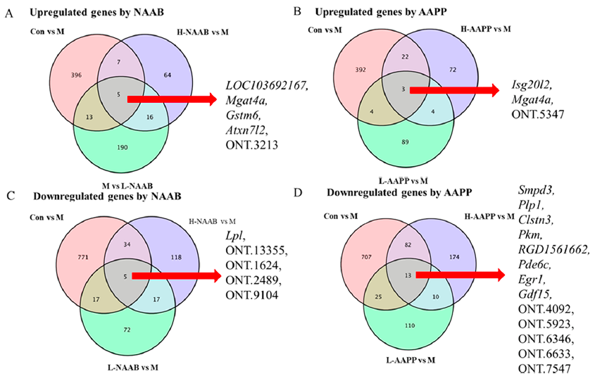 韋恩圖表明了不同分組之間上調(diào)和下調(diào)的DEG的交集,揭示了受NAAB和AAPP影響的特定基因(圖2A?D)。Gstm6與谷胱甘肽代謝、藥物代謝以及細(xì)胞色素P450對(duì)外源物質(zhì)的代謝有關(guān),在胰島素抵抗和糖尿病小鼠中均被報(bào)道下調(diào),并可能參與T2D的進(jìn)展。L-NAAB和H-NAAB均能恢復(fù)Gstm6的表達(dá)。與ND組和Con組相比,M組中有一個(gè)共同的基因被兩種花色苷提取物(NAAB和AAPP)上調(diào),即編碼N-乙酰氨基葡萄糖轉(zhuǎn)移酶GnT-4a的Mgat4a。在小鼠中,Mgat4a基因的遺傳失活導(dǎo)致葡萄糖轉(zhuǎn)運(yùn)蛋白2N-聚糖的錯(cuò)誤組裝,導(dǎo)致葡萄糖轉(zhuǎn)運(yùn)蛋白2和質(zhì)膜凝集素Galectin 9之間的相互作用失敗,導(dǎo)致葡萄糖轉(zhuǎn)運(yùn)蛋白2內(nèi)化,從而抑制葡萄糖攝取和葡萄糖刺激的胰島素分泌。還發(fā)現(xiàn)高脂飲食抑制了Mgat4a的表達(dá)。藍(lán)莓的非?;ㄉ蘸妥仙R鈴薯的?;ㄇ嘬斩际侨绱?。編碼脂蛋白脂肪酶的LPL在小鼠肝臟中過表達(dá),導(dǎo)致肝臟甘油三酯含量增加2倍,并導(dǎo)致胰島素抵抗,部分原因是對(duì)胰島素的反應(yīng)受損,抑制內(nèi)源性葡萄糖的產(chǎn)生。在本研究中,L-NAAB和H-NAAB都下調(diào)了ZDF大鼠高水平的LPL,這可能導(dǎo)致胰島素敏感性的改善。早期生長反應(yīng)基因-1(Egr1)可被胰高血糖素短暫激活,介導(dǎo)胰高血糖素調(diào)節(jié)的糖異生。AAPP降低Egr1,這可能與糖異生減少有關(guān)。