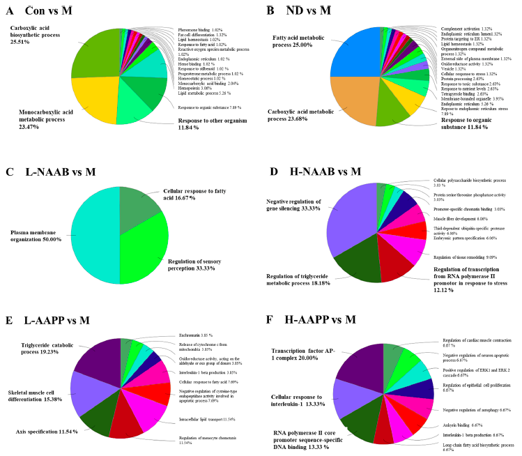 對(duì)不同分組中的DEGs進(jìn)行ClueGO分析,以生成按功能分組的注釋網(wǎng)絡(luò)圖(圖4A?F)。在CON/M差異分組的結(jié)果中,DEGs主要富集在羧酸生物合成過程、單羧酸代謝過程和對(duì)其他有機(jī)物的反應(yīng)過程。在ND/M分組差異結(jié)果中,脂肪酸代謝過程、羧酸代謝過程和對(duì)有機(jī)物的反應(yīng)過程是富集排名前3的功能分組。在ND/M和CON/M分組中,DEGs主要在單羧酸代謝過程、羧酸生物合成過程、脂肪酸代謝過程、脂肪代謝過程和對(duì)有機(jī)物的反應(yīng)過程相關(guān)的通路中富集。在L-NAAB/M分組差異結(jié)果中,DEGs組要與三個(gè)功能通過有關(guān):質(zhì)膜組織、感覺調(diào)節(jié)和細(xì)胞對(duì)脂肪酸的反應(yīng)。在H-NAAB/M差異結(jié)果中,DEGs主要富集于基因沉默的負(fù)調(diào)控、甘油三酯代謝過程的調(diào)控以及RNA聚合酶II啟動(dòng)子對(duì)脅迫反應(yīng)的轉(zhuǎn)錄調(diào)控。在L-AAPP/M比較中,DEGs在甘油三酯分解代謝過程、骨骼肌細(xì)胞分化和軸規(guī)范方面都明顯富集。在H-AAPP/M差異結(jié)果中,發(fā)現(xiàn)轉(zhuǎn)錄因子AP-1復(fù)合體、細(xì)胞對(duì)白細(xì)胞介素-1的反應(yīng)以及RNA聚合酶II核心啟動(dòng)子序列特異性DNA結(jié)合等通路顯著富集。