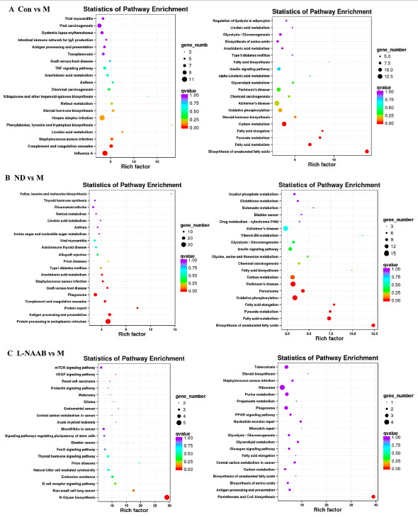 接下來,進(jìn)行了KEGG通路富集分析。氣泡圖展示富集最顯著的前20條通路(圖5A?F)。與M組相比,Con組上調(diào)的DEGs主要富集于以下通路:苯丙氨酸、酪氨酸和色氨酸的生物合成,亞油酸代謝,金黃色葡萄球菌感染,補(bǔ)體和凝血級(jí)聯(lián)反應(yīng),以及甲型流感病毒。ND組與M組相比,上調(diào)的DEGs主要富集在花生四烯酸代謝、金黃色葡萄球菌感染、移植物抗宿主病、吞噬小體等通路中,而ND組與M組相比上調(diào)的DEGs主要富集在以下通路:苯丙氨酸、酪氨酸和色氨酸的生物合成、亞油酸代謝、金黃色葡萄球菌感染、移植物抗宿主病、吞噬小體。在CON/M和ND/M比較中,下調(diào)的DEGs在相似的KEGG通路中富集:不飽和脂肪酸的生物合成、脂肪酸代謝、丙酮酸代謝、脂肪酸伸長、氧化磷酸化和碳代謝。