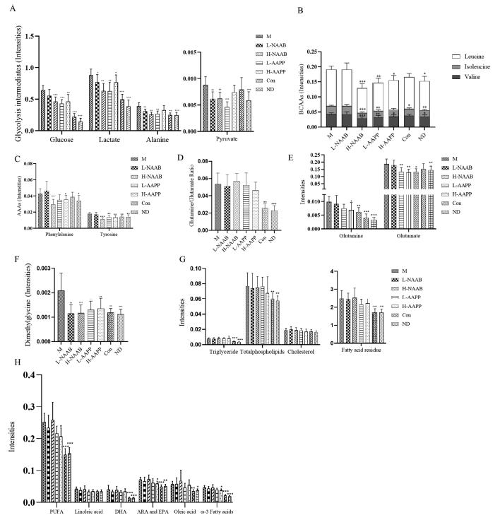 然而,ZDF大鼠中谷氨酰胺/谷氨酸比值對(duì)花青苷提取物無反應(yīng)(圖6D),但L-AAPP和H-AAPP降低谷氨酰胺和谷氨酸,H-NAAB降低谷氨酸(圖6E)。與M相比,所有花青苷處理組的二甲基甘氨酸升高的水平都被逆轉(zhuǎn)到正常狀態(tài)(圖6F)。與M組相比,編碼甜菜堿-同型半胱氨酸S-甲基轉(zhuǎn)移酶的BHMT均降低。在脂質(zhì)代謝產(chǎn)物方面,L-AAPP組和H-AAPP組的肝脂譜略有改善,表現(xiàn)為脂肪酸殘留量、包括ω-3脂肪酸在內(nèi)的不飽和脂肪酸和Ara+EPA的下降趨勢(shì)(圖6G?H)。M組顯示出總體脂質(zhì)譜增加,如高水平的磷脂、甘油三酯、脂肪酸和不飽和脂肪酸,所有這些都有助于脂肪肝的發(fā)展。L-AAPP和H-AAPP組通過調(diào)節(jié)脂肪酸殘基和不飽和脂肪酸略有改善肝脂代謝。