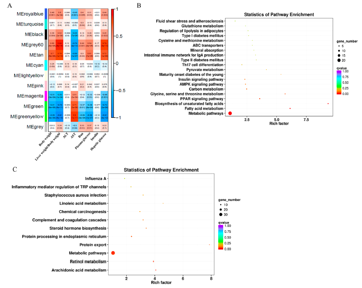 使用DEGs進(jìn)行WGCNA分析以確定共表達(dá)模塊及其與臨床特征的相關(guān)性。確定了12個(gè)共表達(dá)模塊,并與以前報(bào)道的各種臨床特征(體重、AST、ALT、血尿素氮、血糖和胰島素)相關(guān)(圖7A)。MEgery 60和MEtan模塊與體重、肝重/體重比、血糖、肝糖呈正相關(guān),與天冬氨酸轉(zhuǎn)氨酶呈負(fù)相關(guān)。MEgreen和MEgreenyellow模塊與體重、肝重/體重比、血糖、肝糖呈負(fù)相關(guān),與AST值呈正相關(guān)。