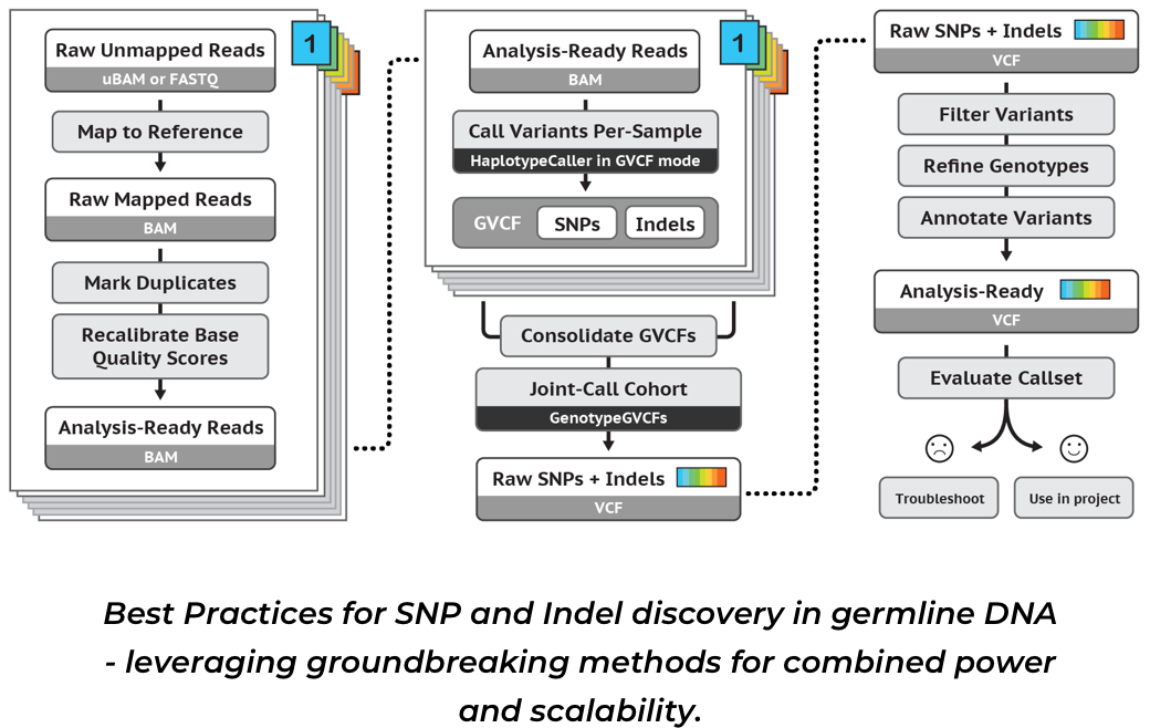 GATK全稱是The Genome Analysis Toolkit,是Broad Institute(The Broad Institute, formerly the Broad Institute of MIT and Harvard, evolved from a decade of research collaborations among MIT and Harvard scientists.)開發(fā)的用于二代重測序數(shù)據(jù)分析的一款軟件,里面包含了很多有用的工具,主要注重與變異的查找,基因分型且對于數(shù)據(jù)質(zhì)量保證高度重視。GATK是目前業(yè)內(nèi)使用較廣的基因數(shù)據(jù)變異檢測工具。本次課程基于GATK的Best?Practices,實現(xiàn)從原始的比對結(jié)果開始,到最終的高質(zhì)量突變位點的完整信息分析流程。