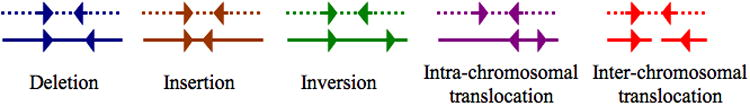 高通量測序數(shù)據(jù)除了可以分析SNP/InDel位點外,還可以利用雙端測序的中的插入片段長度信息和比對時出現(xiàn)的異常比對結(jié)果,對測序樣本中可能存在的結(jié)構(gòu)變異進(jìn)行分析。本次課程主要利用BreakDancer這款軟件進(jìn)行結(jié)構(gòu)變異位點的分析,軟件主要預(yù)測了五種類型的結(jié)構(gòu)變異:插入、缺失、倒位、染色體間和染色體內(nèi)易位,